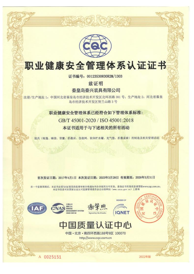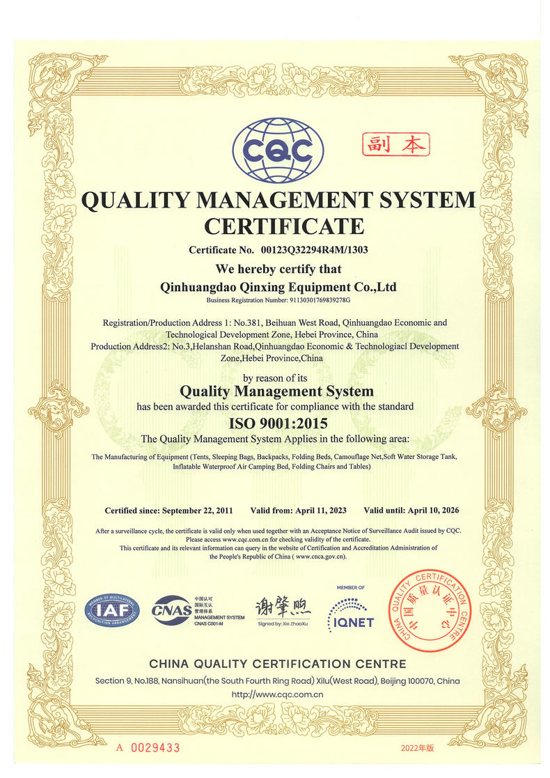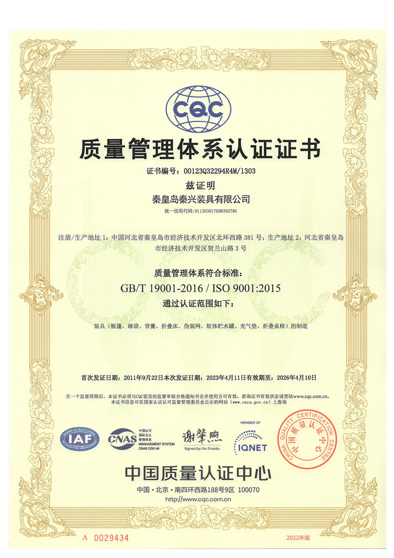 秦皇島秦興裝具有限公司有限公司源于我國第3524工廠,創(chuàng)建于2005年,占地面積30畝,是一家致力于研究,發(fā)展,制造和銷售為一體的綜合性裝具及紡織服裝加工生產(chǎn)企業(yè),我們的主要產(chǎn)品有單、棉帳篷,民用帳篷,旅游帳篷集各種機(jī)工產(chǎn)品等。